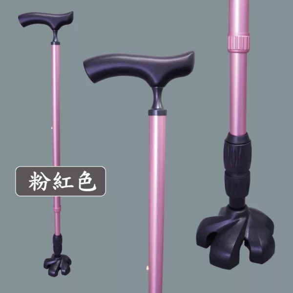 模擬腳踝活動設計,使著地的五腳始終保持緊貼地面,360度可轉動的避震器腳墊,有著大面積底座,提供長者行走在柏油路、斜坡、台階、石頭路等路面行走施力更穩定,全方位避震底座設計讓拐杖落地時手感舒適,手杖隨時隨地可以站立不傾倒,用餐、休息、購物沒煩惱,使用具備舒適與便利性,是協助老人行進時的輔助工具。