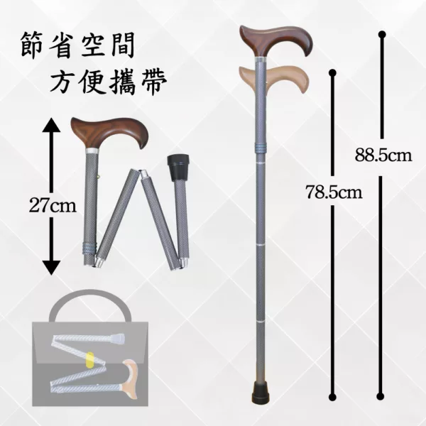 2.方便攜帶:摺疊拐杖的小尺寸和輕量化設計,使用者可以輕鬆攜帶到外出的場合,如旅遊、購物、運動等場合。